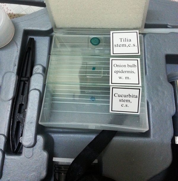 Kính hiển vi học sinh có mâm xoay bao gồm 3 vật kính cho phép thay đổi độ phóng đại ở 3 mức 300x; 600x và 1200x. Hệ thống chiếu sáng bao gồm gương phản xạ tích hợp với đèn pin tụ sáng (ở mặt đối diện) sử dụng 2 pin tiểu loại AA. Ngoài ra nó còn khá nhiều phụ kiện hỗ trợ khác như đèn dự trữ, bộ dao + ống hút thí nghiệm, 03 lọ đựng mẫu vật, 1 hộp đựng lam kính kèm 3 mẫu vật là Onion (tế bào hành tây); Tilia và Cucurbita…
