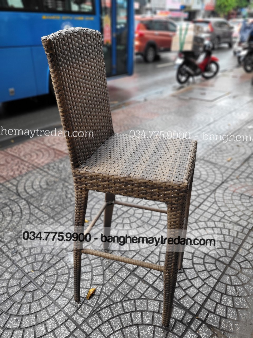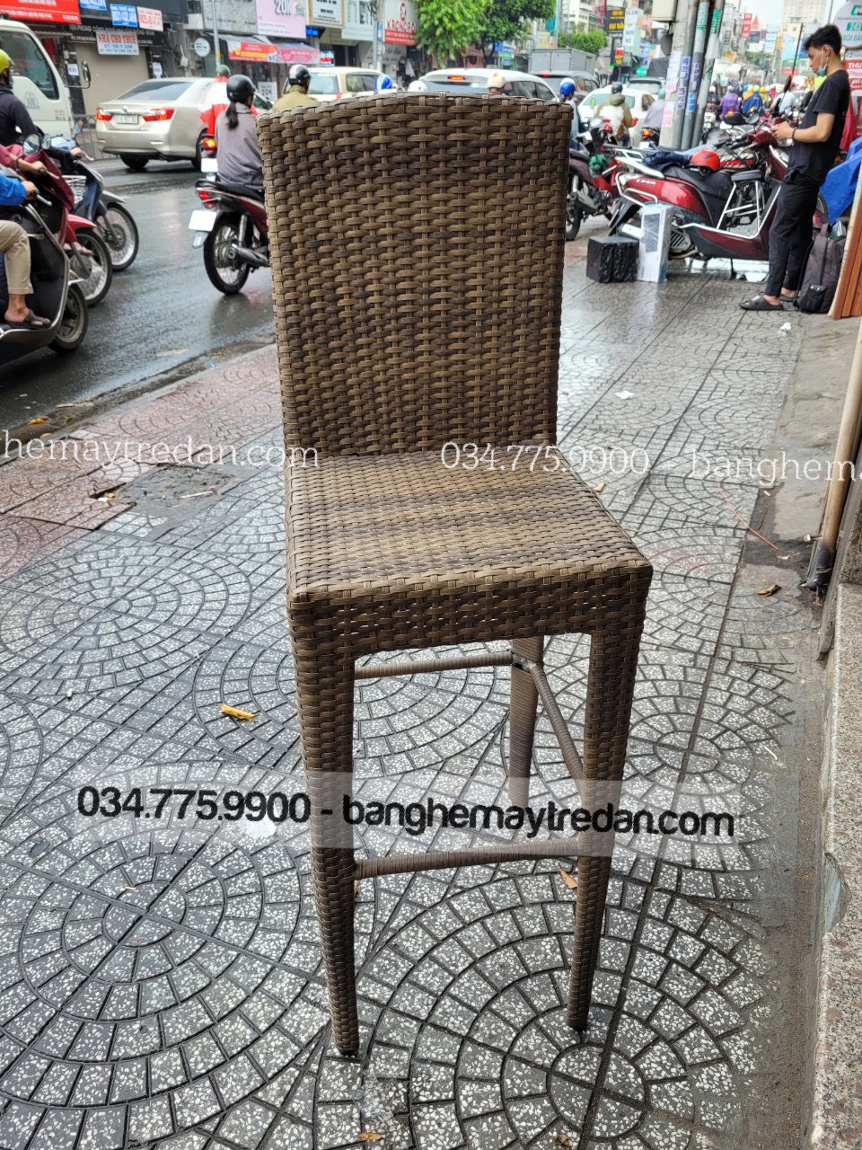 Ghế bar được đan từ dây nhựa giả mây cao cấp, mang đến sự thoải mái và êm ái cho khách hàng. Lưng ghế cao cung cấp hỗ trợ tuyệt vời cho lưng và cột sống, giúp khách ngồi thoải mái trong thời gian dài.