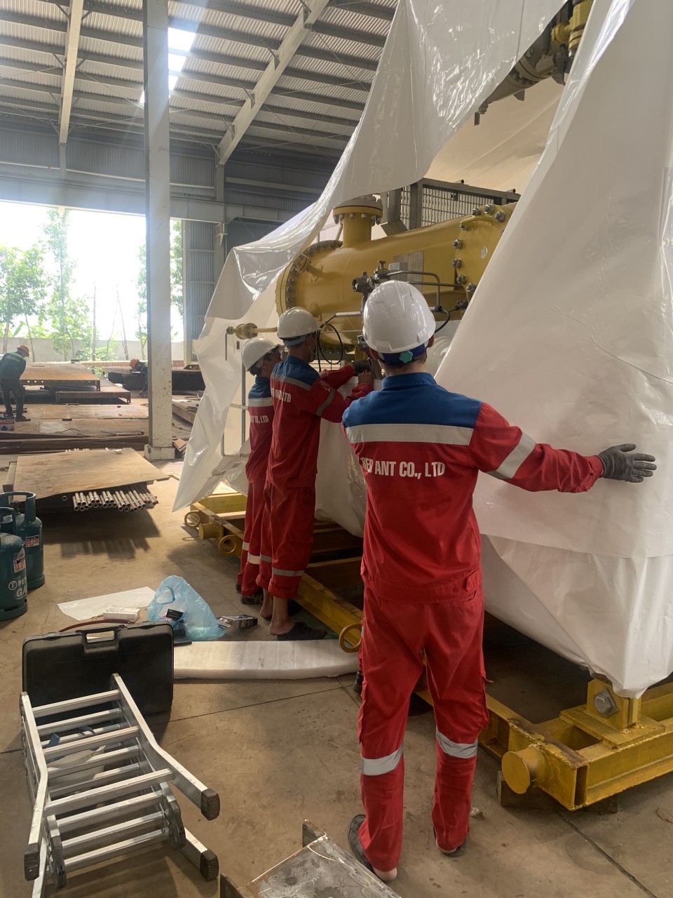 Máy móc quá khổ nếu đóng vào thùng gỗ thì chi phí rất cao, dẫn đến các doanh nghiệp khó bán được hàng. vậy nên giải pháp mà Kiến Đỏ đưa ra chính là sử dụng màng co nhiệt để đóng gói, giúp đảm bảo hang hóa không bị bụi bẩn, oxy hóa khi đi biển, tránh ảnh hưởng trực tiếp từ tia cực tím và tiết kiệm giá thành rất lớn.