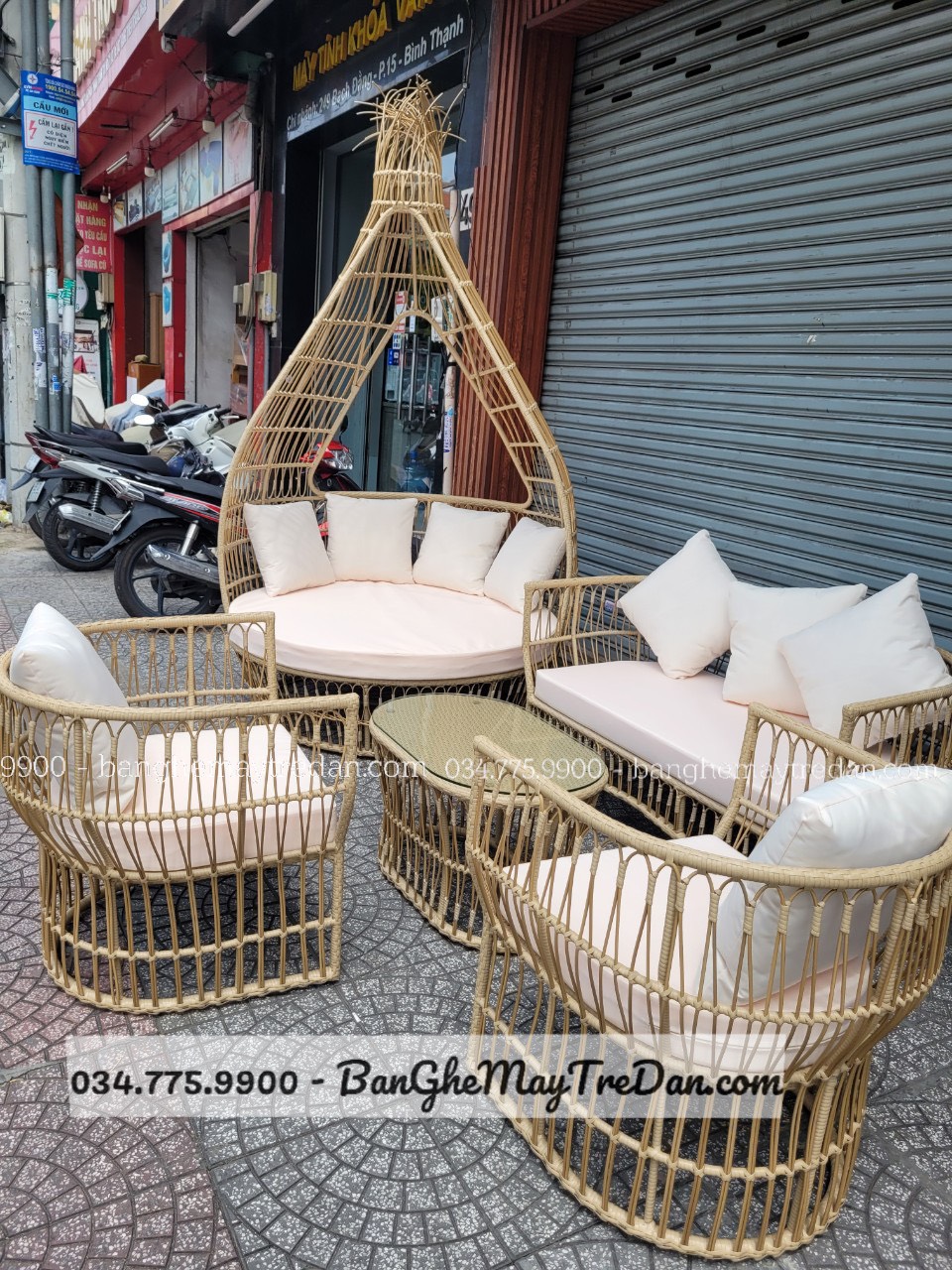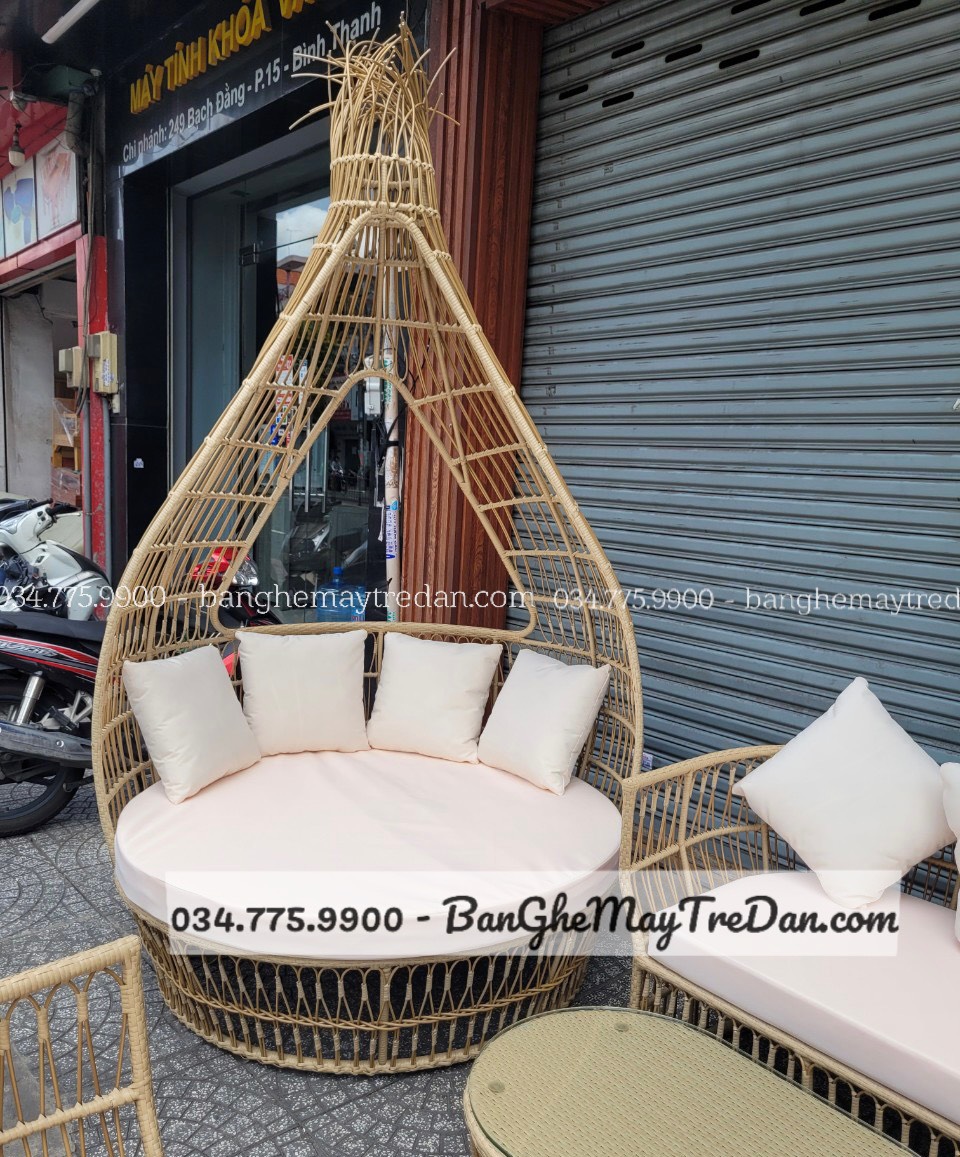Với 2 ghế đơn, 1 băng dài, 1 bàn và 1 ghế tổ chim decor size lớn, bộ ghế này sẽ là điểm nhấn hoàn hảo trong không gian ngoại thất của bạn.