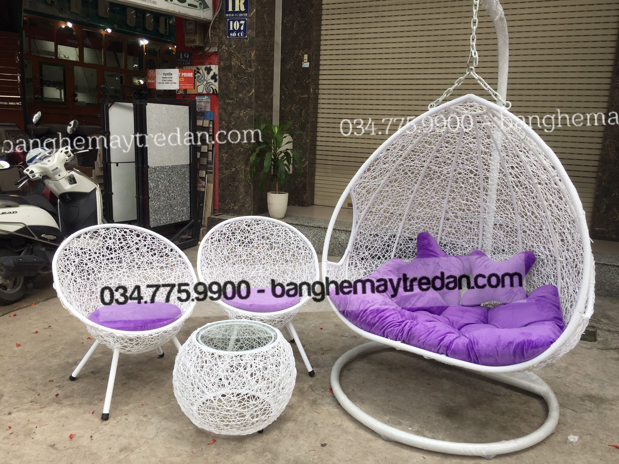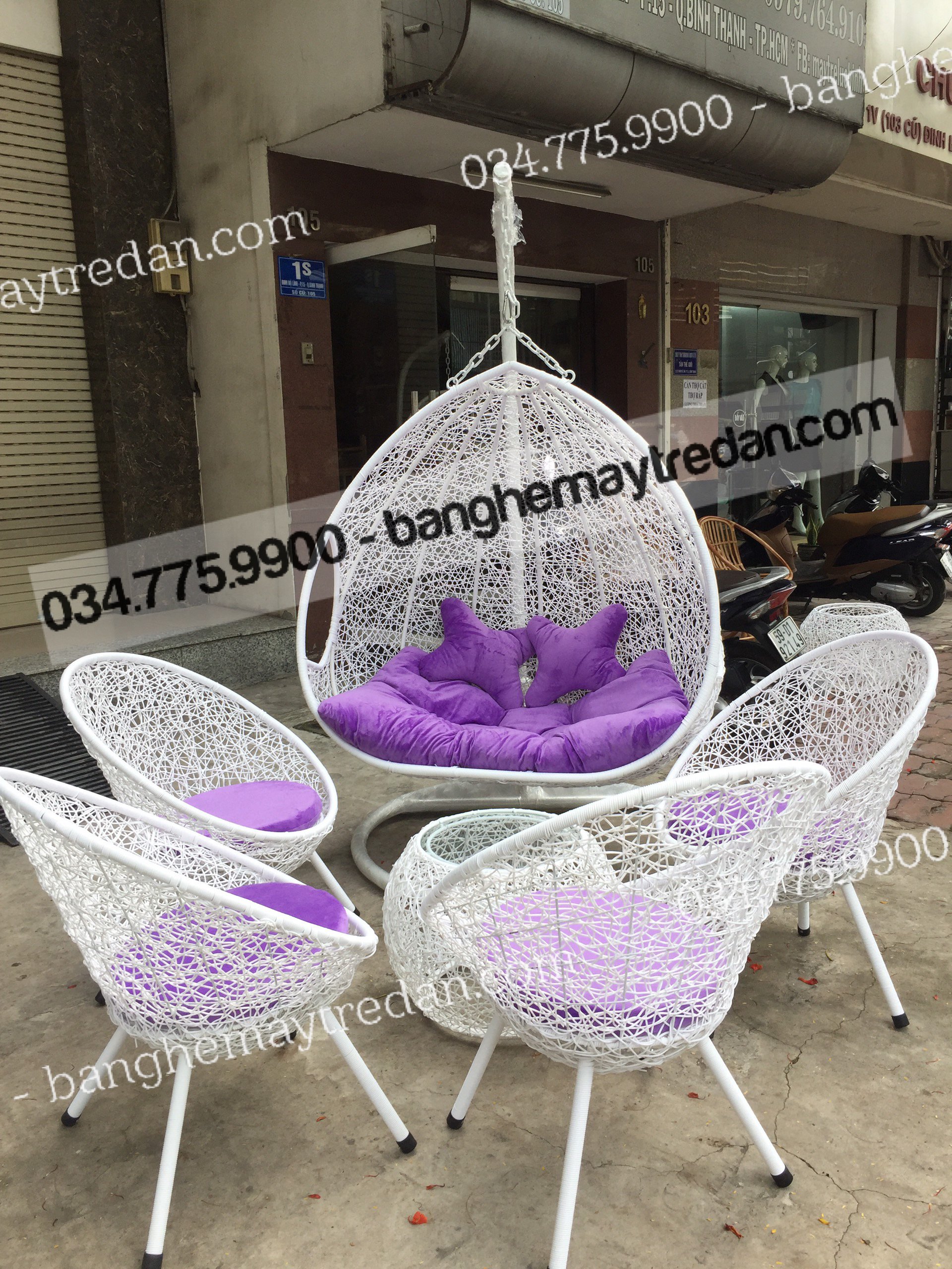Màu tím tạo ra không gian lãng mạn và thư giãn. Nệm có đệm mút dày giúp cung cấp sự thoải mái và hỗ trợ tốt khi ngồi hoặc nằm trên xích đu.