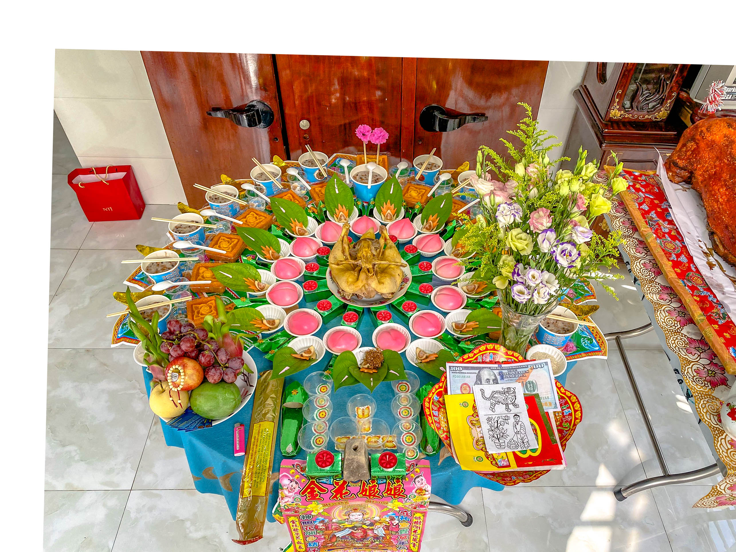 Mâm cúng mụ cho bé với bánh bao đào tiên.