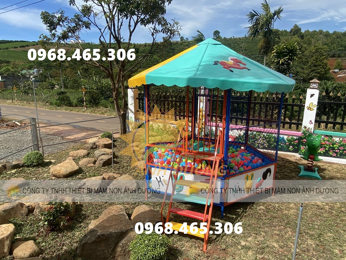 Nhà banh ngoài trời có kết cấu thép vững chắc, nhiều chân đỡ, diện tích khá lớn, lưới bao quanh an toàn cho bé khi chơi, màu sắc tươi sáng, bắt mắt.