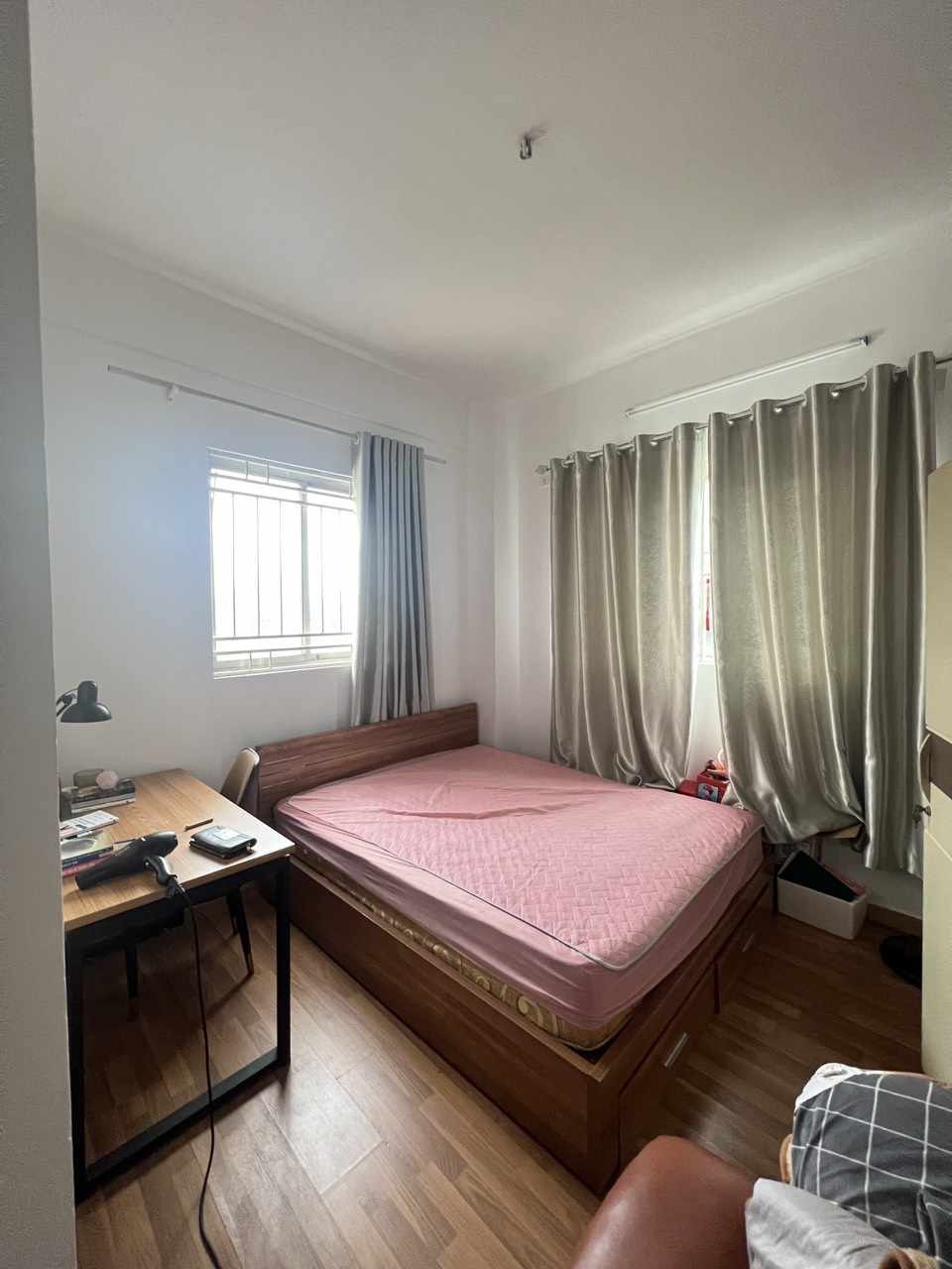 Căn hộ có 2 phòng ngủ rộng, 1 vệ sinh, khách bếp thông nhau, 2 ban công hướng mát, cửa ra vào hướng Tây nên cả ngày mát mẻ, tràn ngập ánh sáng tự nhiên.