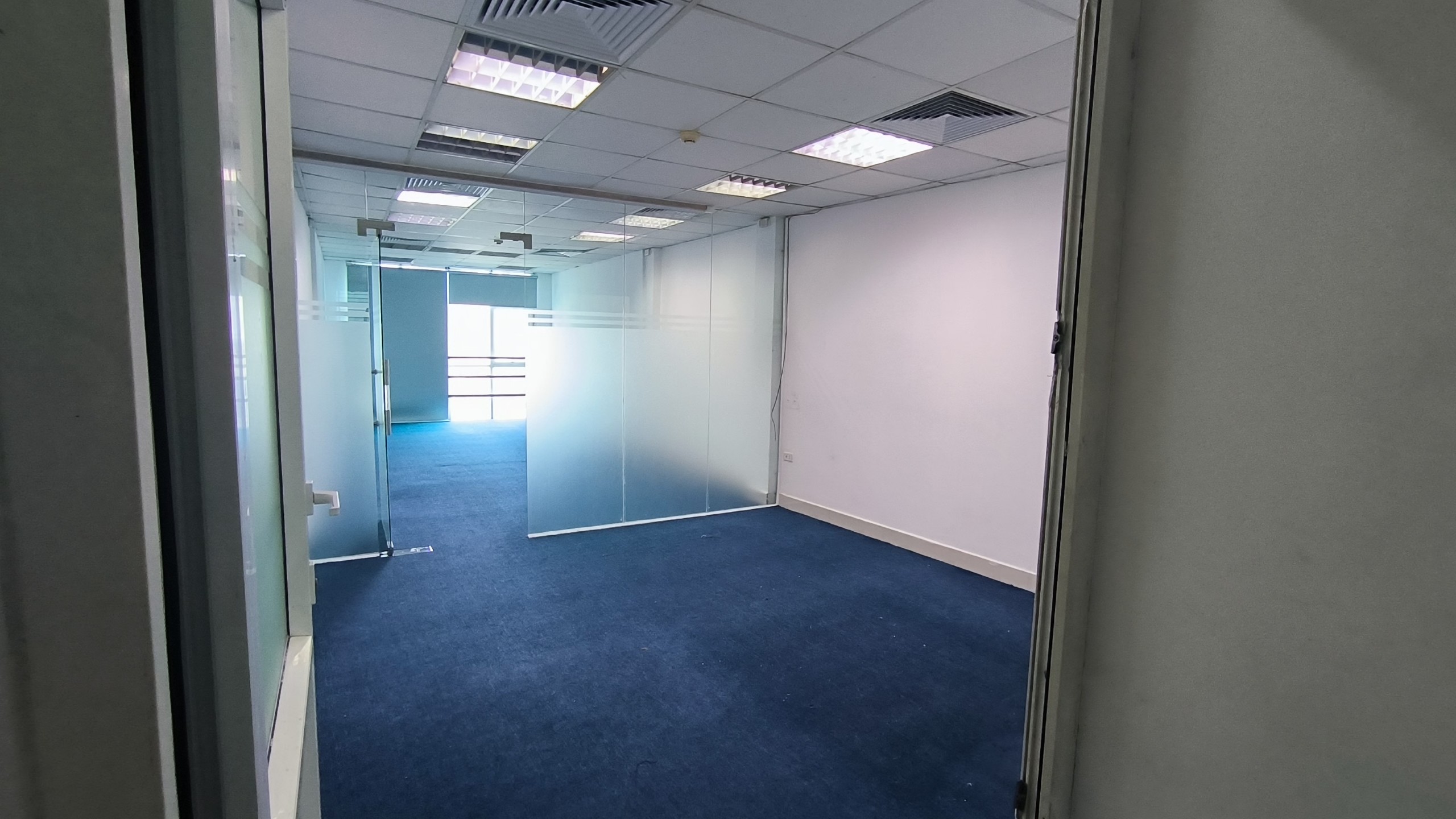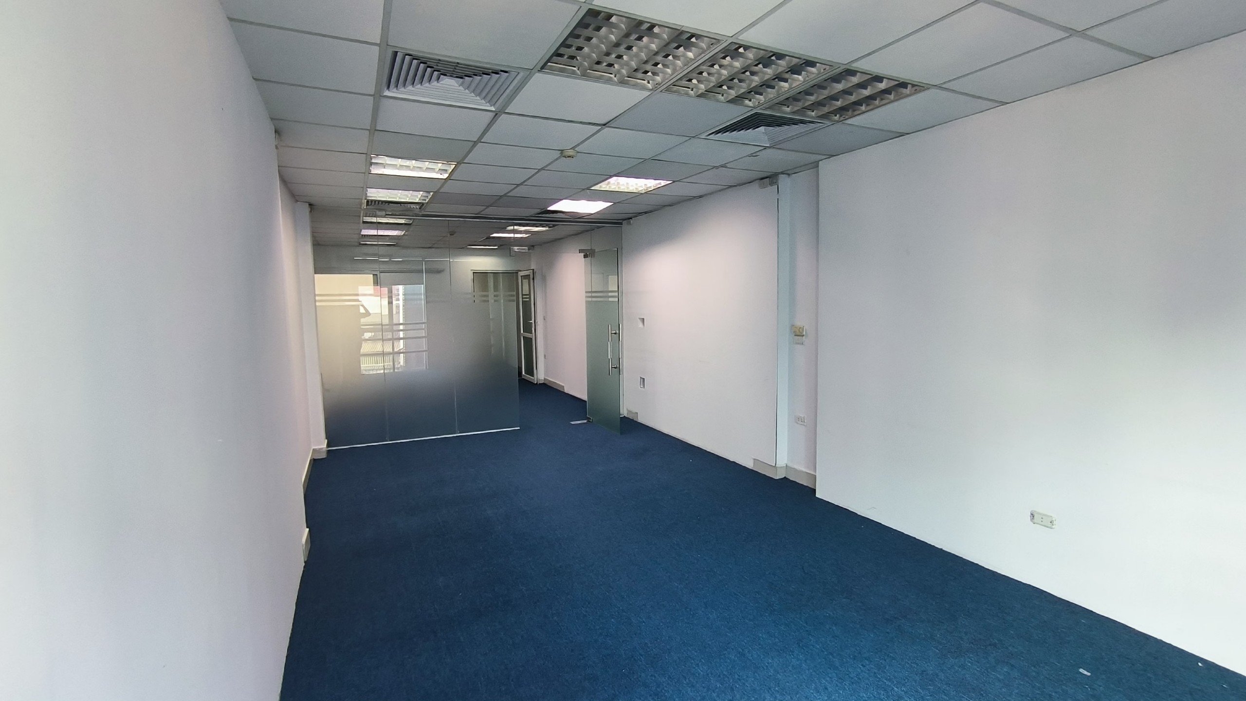Có trần, sàn, điều hòa âm trần, hệ thống đèn chiếu sáng đầy đủ.