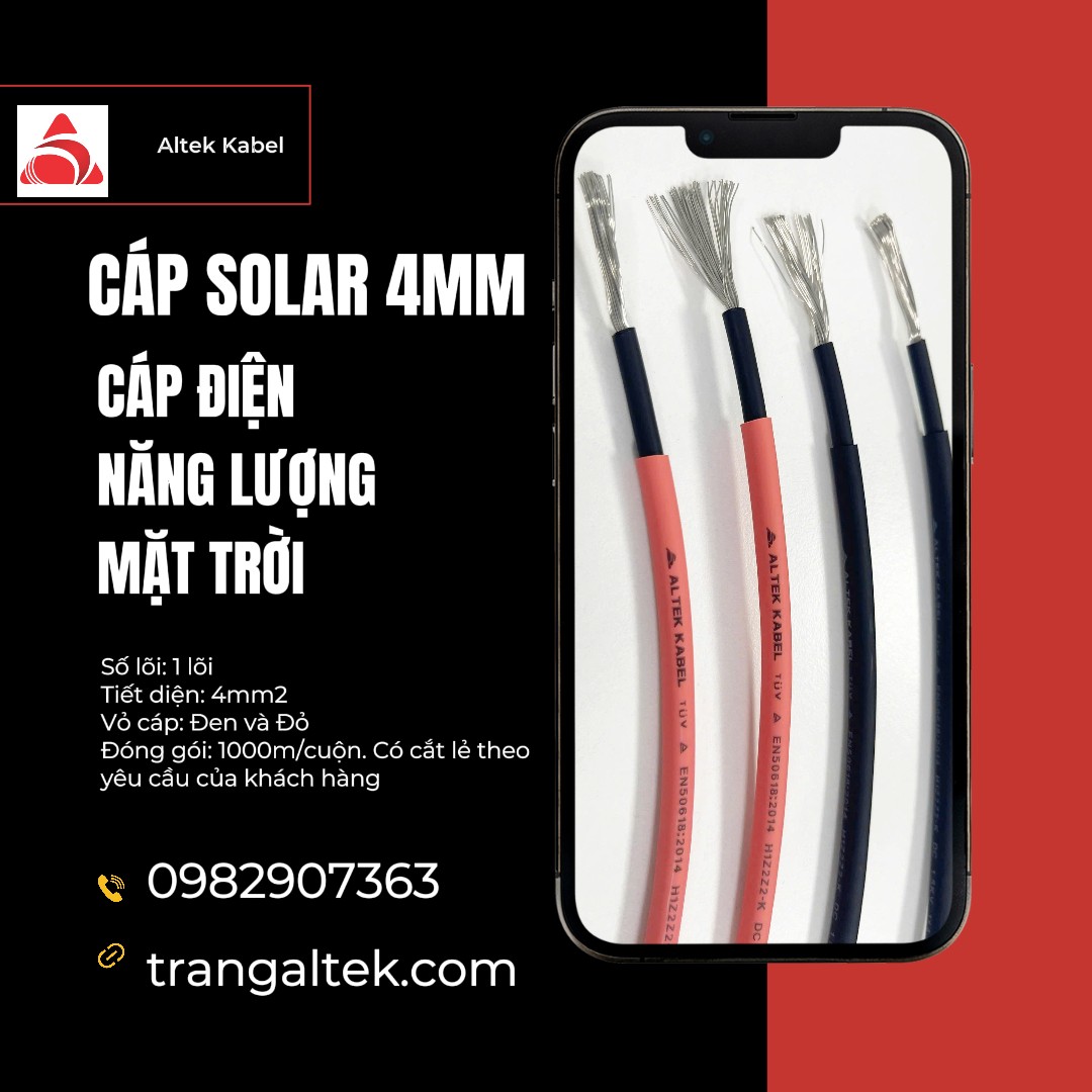 Cáp solar Altek Kabel được sản xuất theo tiêu chuẩn quốc tế, đảm bảo độ bền, chống tia UV và chịu nhiệt tốt. Đây là lựa chọn lý tưởng cho các hệ thống điện mặt trời cần sự ổn định và tuổi thọ lâu dài.