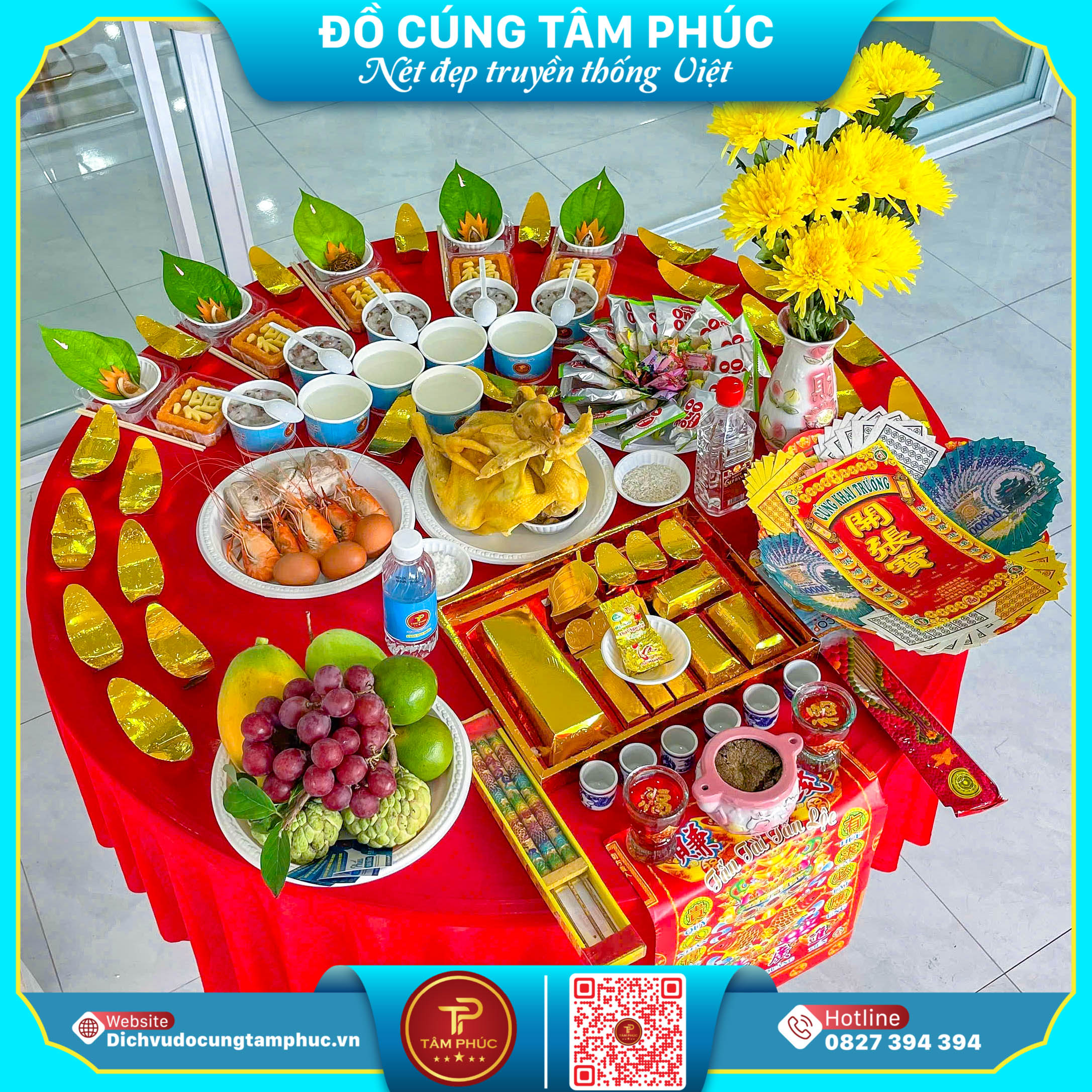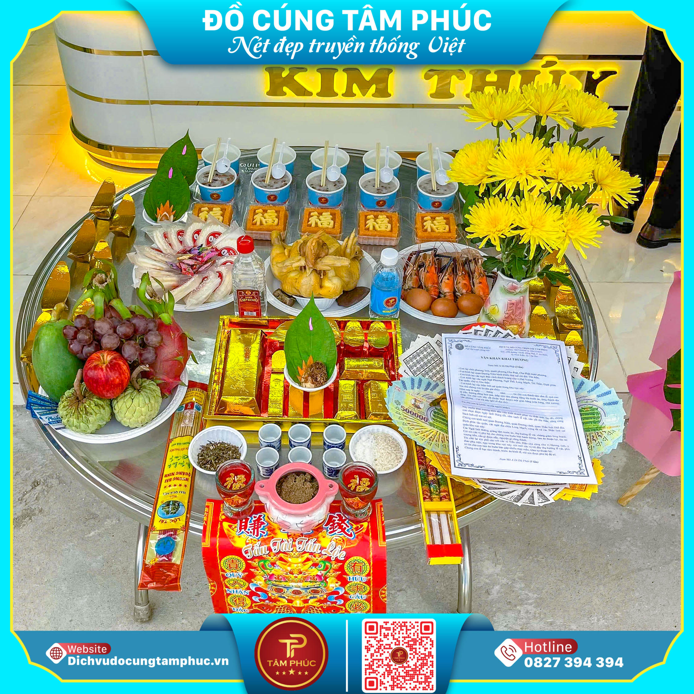 Dịch vụ đồ cúng trọn gói Tâm Phúc chuyên cung cấp mâm cúng đầy đủ, bày biện đẹp mắt, giao tận nơi – giúp gia chủ tiết kiệm thời gian và yên tâm khai trương.