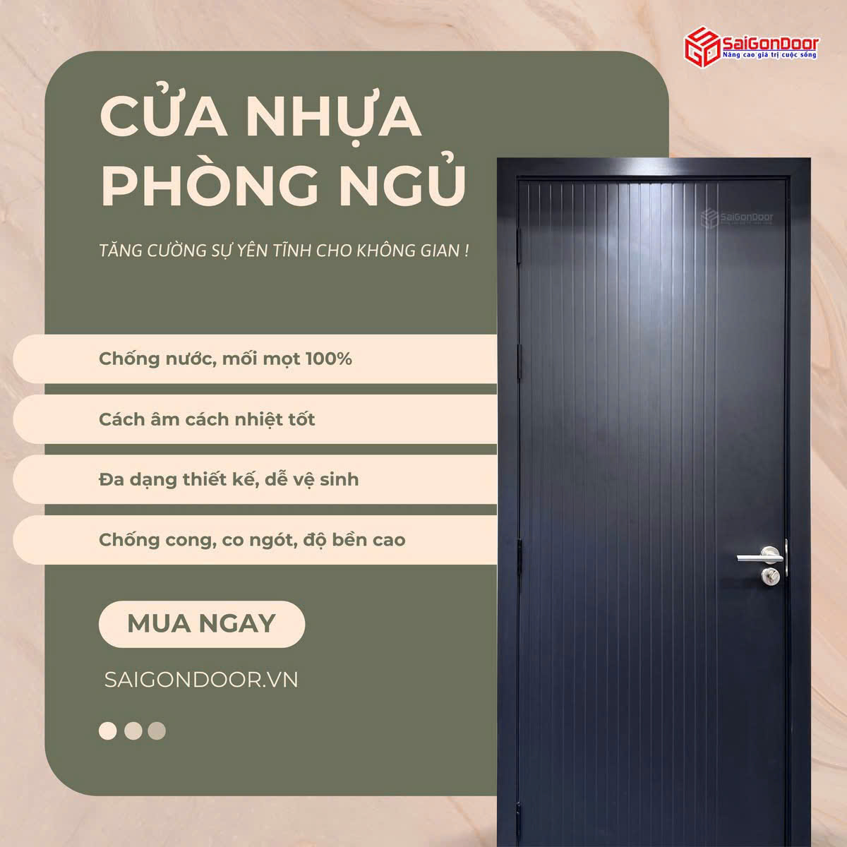 Nếu bạn yêu thích phong cách tối giản, trẻ trung kiểu Hàn Quốc thì đây là lựa chọn số 1. Cửa nhựa phòng ngủ làm từ nhựa ABS có ưu điểm là cực kỳ nhẹ, giảm thiểu tình trạng xệ bản lề. Màu sắc của cửa nhựa ABS thường rất đa dạng, từ các tông màu sáng như trắng, kem đến các tông màu trầm ấm, mang lại cảm giác thanh thoát cho không gian nghỉ ngơi.
