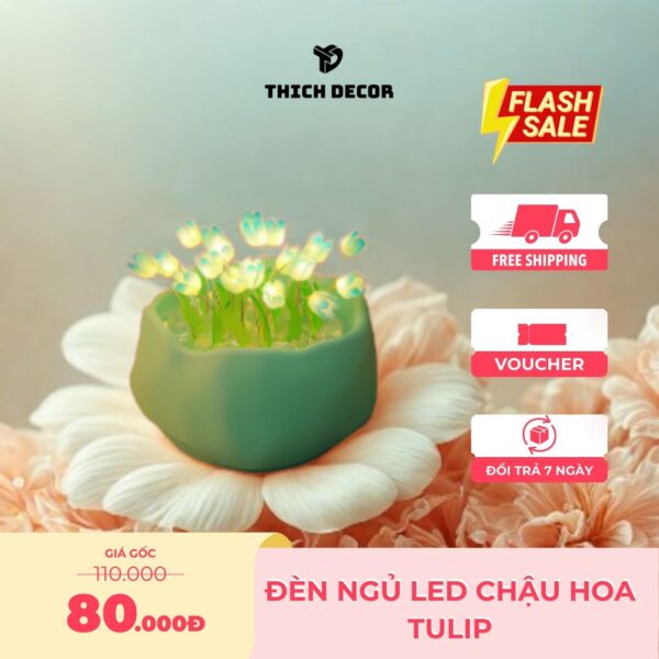 Đèn ngủ LED hoa Tulip là món đồ trang trí phòng ngủ vừa đẹp mắt vừa tiện ích, được nhiều bạn nữ săn đón hiện nay. Sản phẩm gồm một chậu thủy tinh nhỏ xinh có đường kính 5cm, bên trong chứa 10 bông hoa Tulip kèm lá và đá trang trí. Đèn có 4 màu sắc để màu lựa chọn: tím, hồng, xanh và vàng, mỗi màu đều mang ý nghĩa riêng: vàng biểu tượng cho may mắn, ánh nắng và tình bạn; xanh biểu thị sự yên bình và chân thành; hồng thể hiện tình yêu và đam mê; tím mang tinh hoàng gia, quyền lực và lãng mạn.