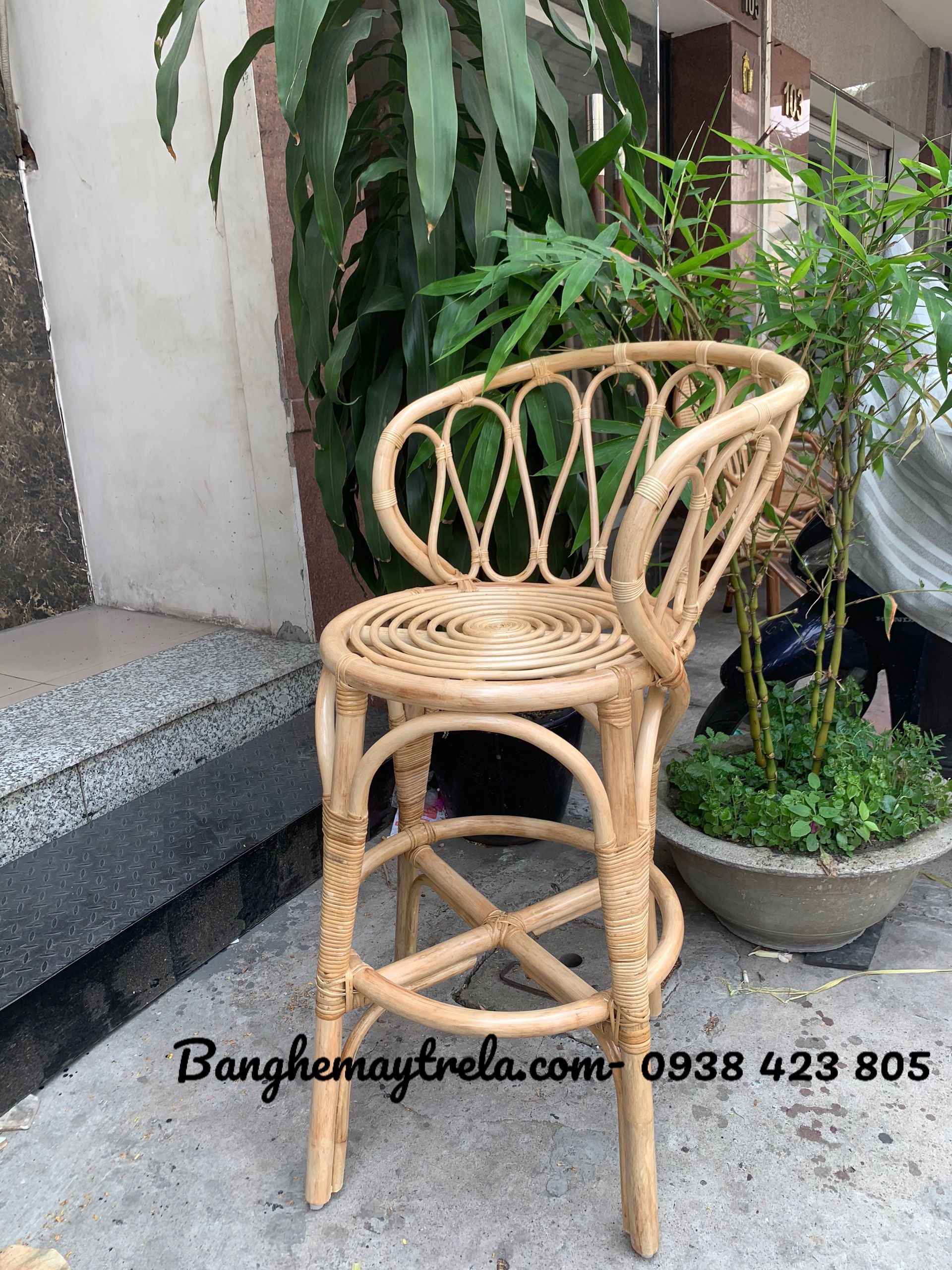 Ghế bar mây cao được đan thủ công từ mây tre tự nhiên, mang vẻ đẹp mộc mạc nhưng không kém phần sang trọng. Thiết kế chiều cao chuẩn quầy bar, có gác chân chắc chắn, giúp ngồi thoải mái trong thời gian dài.