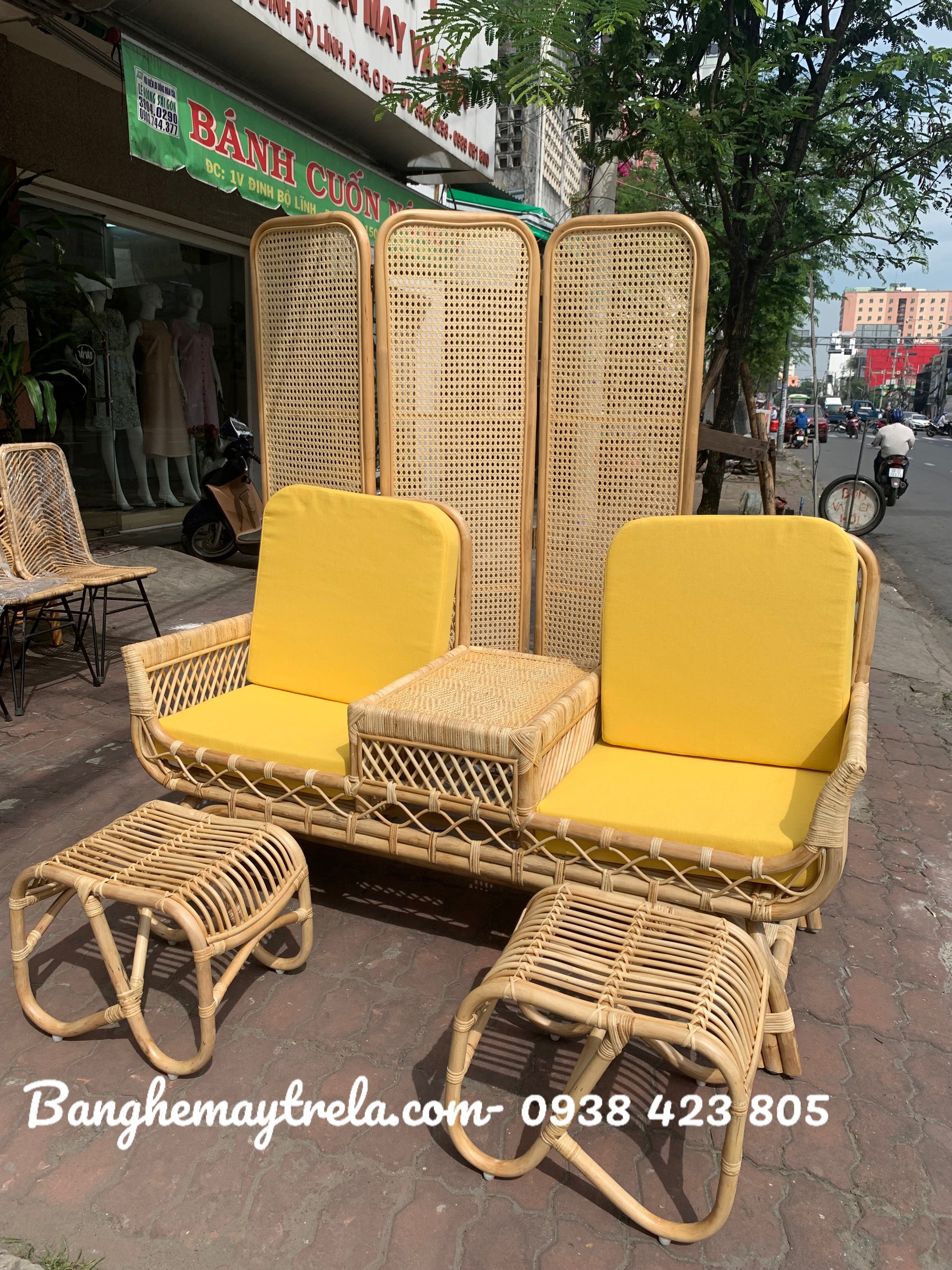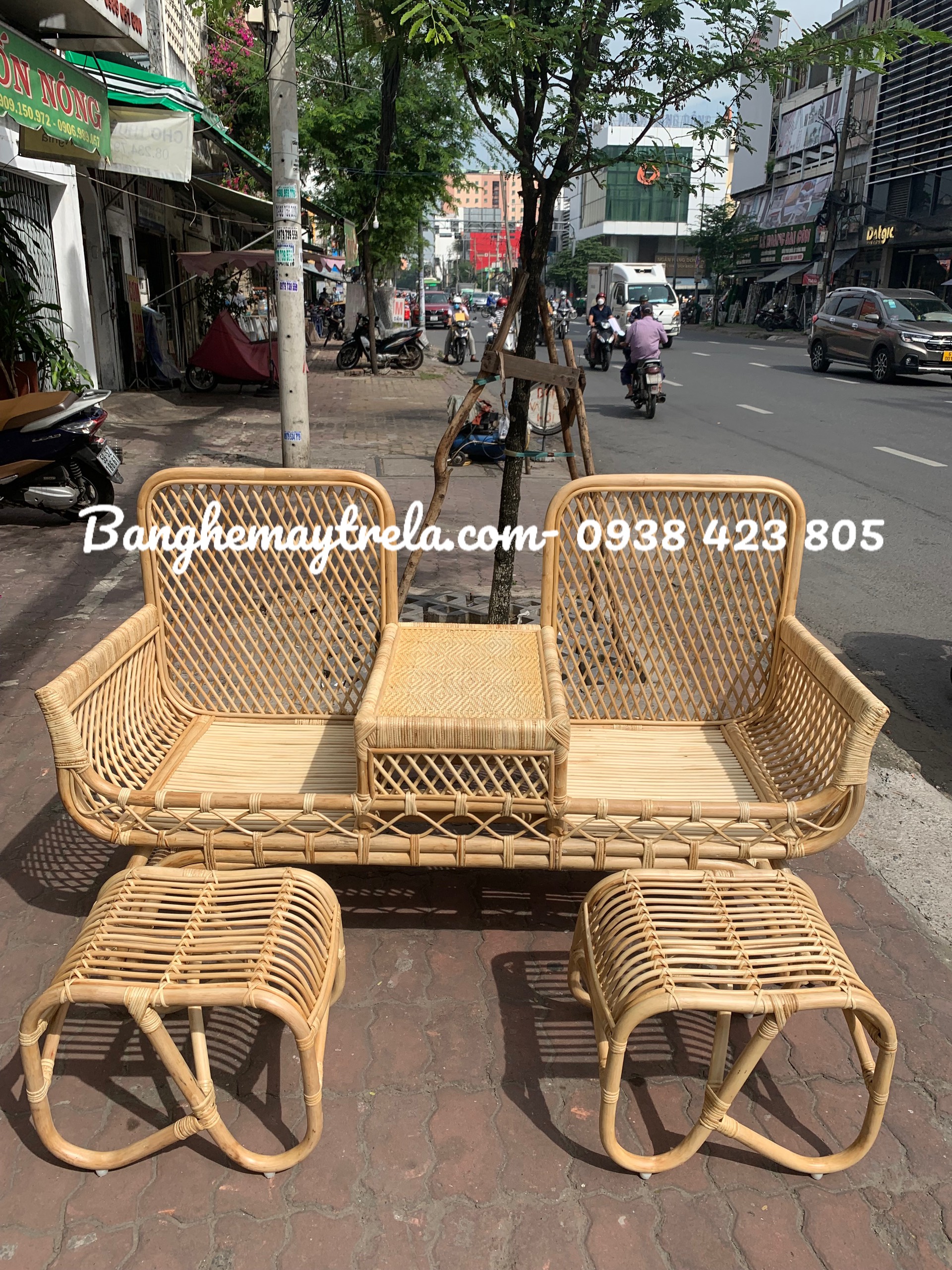 Ghế sofa đôi mây tự nhiên kèm đôn gác chân cho tiệm spa chị đẹp quận 7