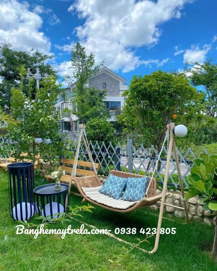 Không cần nói quá nhiều, chỉ cần một chiếc xích đu nhựa giả mây – đan tay mộc mạc, dáng cong tinh tế – là đủ để kể một câu chuyện.