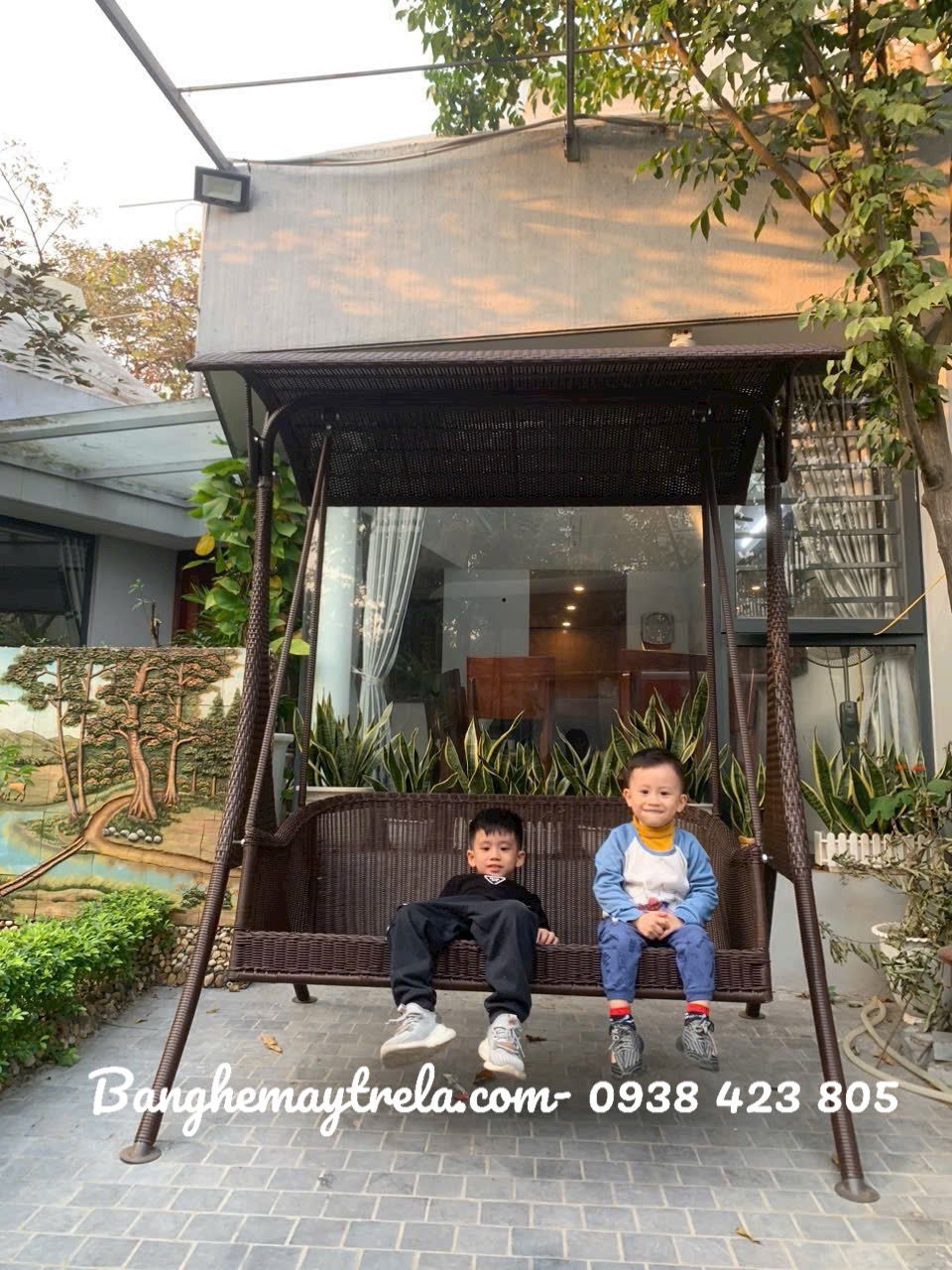 Tận hưởng những phút giây thư giãn cùng người thân với ghế xích đu đôi mây nhựa sang trọng và bền đẹp.