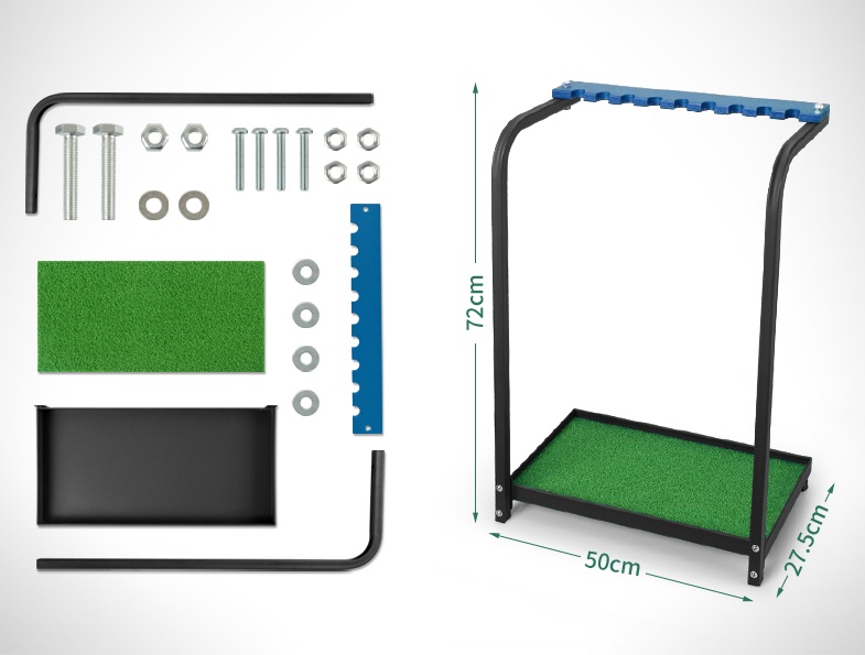 Chất liệu gồm khung sắt và kệ để gậy bằng gỗ phủ melamin, đế lót cỏ nhân tạo chống xước gậy.