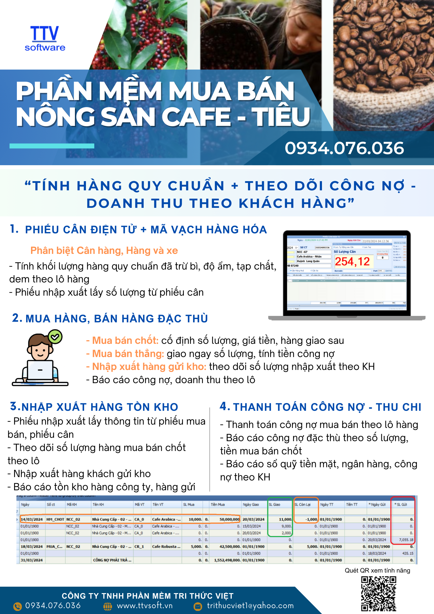 1. Cân hàng: Kết nối trực tiếp cân điện tử & Camera. Tự động tính quy chuẩn (bì, độ ẩm, tạp chất, zem...). Chỉnh sửa theo công thức riêng cho doanh nghiệp