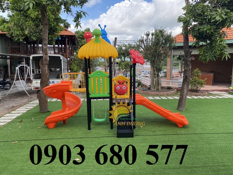- Cầu trượt gồm các chi tiết máng trượt, phù điêu, ghế xích đu được làm bằng nhựa PP nguyên sinh, chuyên sử dụng cho ngoài trời.