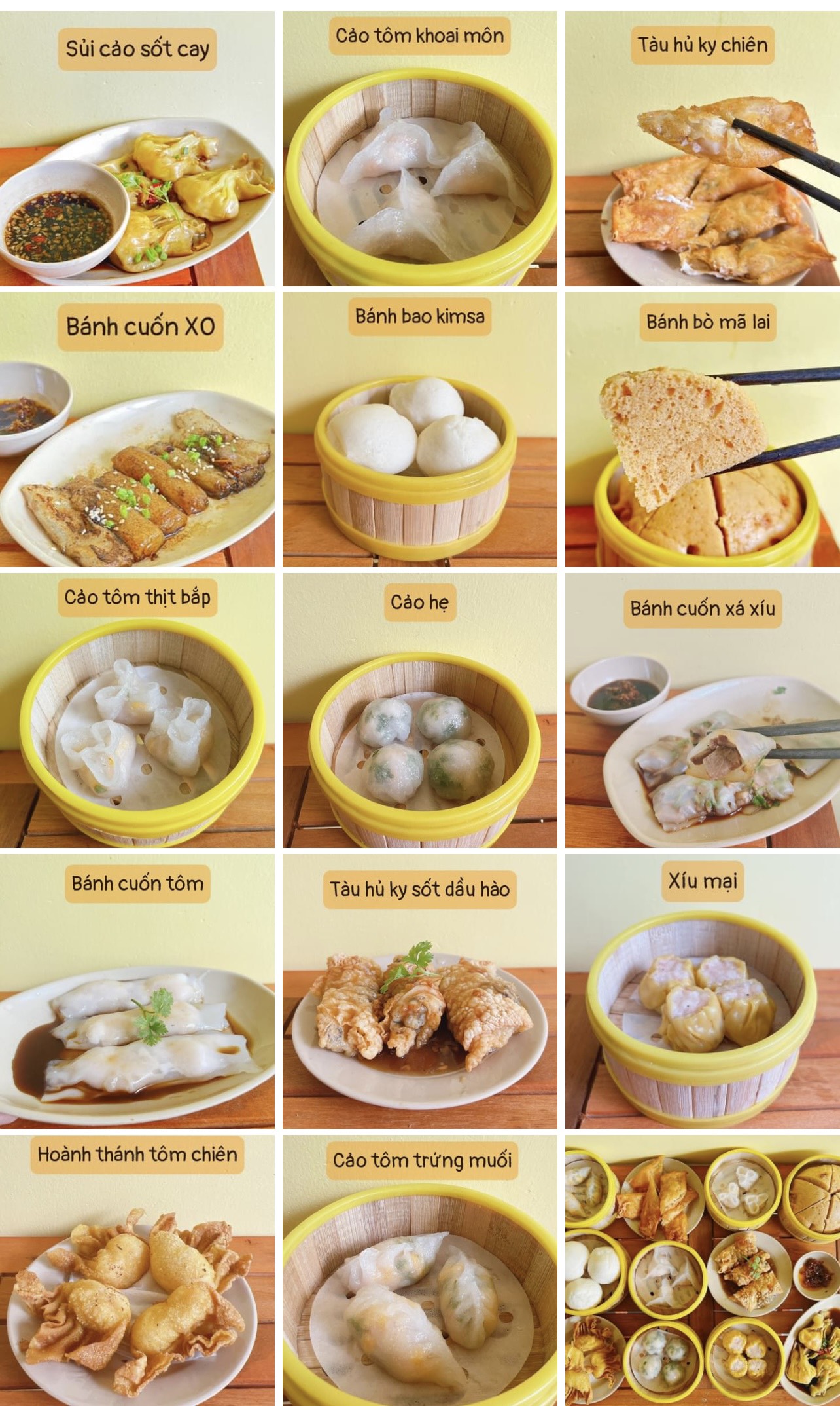 Quán chuyên về dimsum nên có tất tần tật các món ăn từ các món dimsum há cảo, bánh cuốn tôm tươi,hoành thánh sốt cay, đậu hũ ky sốt dầu hào, bánh bao kim sa,...Món nào cũng nóng hổi, chuẩn vị vừa ăn, giá cả phải chăng không thể tìm thấy ở đâu khác.