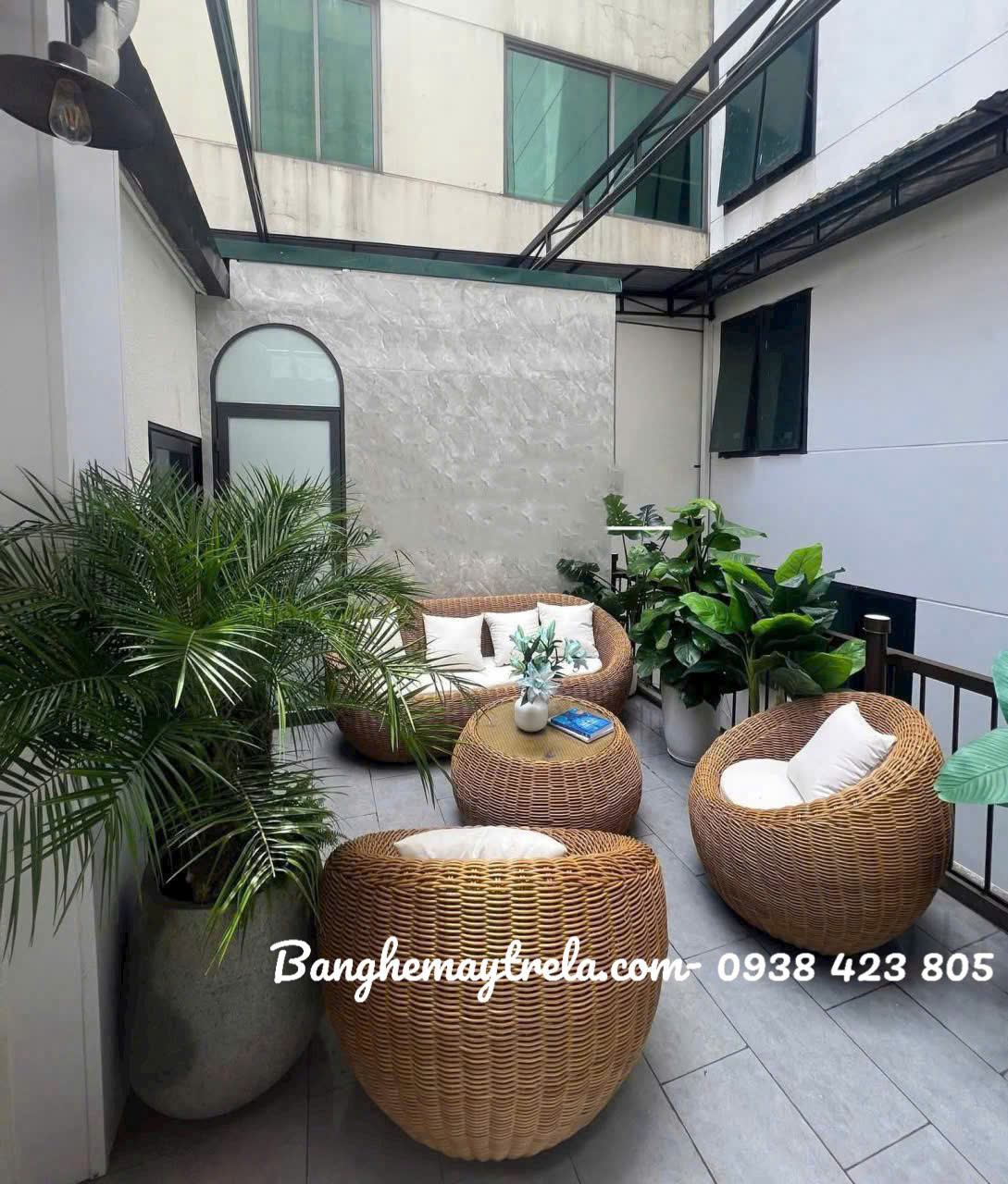 Sofa sò nhựa giả mây không chỉ đẹp mắt mà còn chịu nắng mưa tốt, dễ vệ sinh và giữ dáng lâu dài.