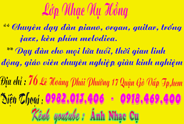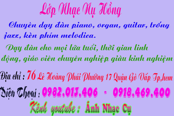 Trung Tâm Dạy Nhạc Tại Gò Vấp, Piano, Organ, Guitar,Trống LỚP NHẠC NỤ HỒNG DẠY ĐÀN ORGAN , GUITAR , PIANO, TRỐNG JAZZ, KÈN PHÍM MELODICA Đội ngũ giáo viên chuyên nghiệp, nhiệt tình. Phương pháp giảng dạy đàn dễ hiểu, tiết kiệm thời gian của học viên. Dạy đàn organ, guitar, piano, trống jazz sẽ được thực hành trực tiếp trên nhạc cụ mà bạn học ! Tại lớp nhạc có sẵn nhạc cụ cho học viên luyện tập Đăng ký ngay để được hưởng nhiều ưu đãi. Liên hệ : 0982.013.406 – 0918.469.400 (Cô Ánh - Thầy Cường) Cửa hàng nhạc cụ - lớp nhạc - cơ sở sản xuất đàn Nụ Hồng Dạy đàn piano - organ - trống – guitar – kèn phím melodica . Mua - bán - sửa chữa - cho thuê tất cả các loại nhạc cụ. Qúy khách có thể liên hệ qua : Zalo : 0918.469.400 Facebook : lopnhacnuhong.com Website : lopnhacnuhong.com Cuahangnhaccu.vn Kênh youtube : Ánh Nhạc Cụ Âm Nhạc Và Em Quý khách đến trực tiếp cửa hàng theo địa chỉ: Địa chỉ: 76 Lê Hoàng Phái - Phường 17 - Quận Gò Vấp - Tp.HCM. (Gần ngã tư: Nguyễn Oanh - Nguyễn Văn Lượng) Có ship COD toàn quốc. Hotline: 0918.469.400 - 0982.013.406 (Thầy Cường - Cô Ánh)