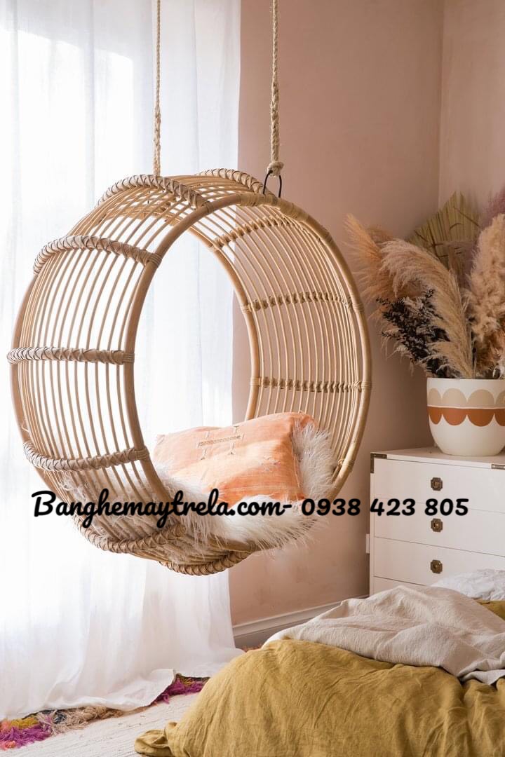 Mang phong cách hiện đại kết hợp nét mộc mạc tự nhiên, ghế xích đu mây tròn treo trần nhà là lựa chọn lý tưởng để biến không gian sống thêm phần sang trọng và thư giãn.