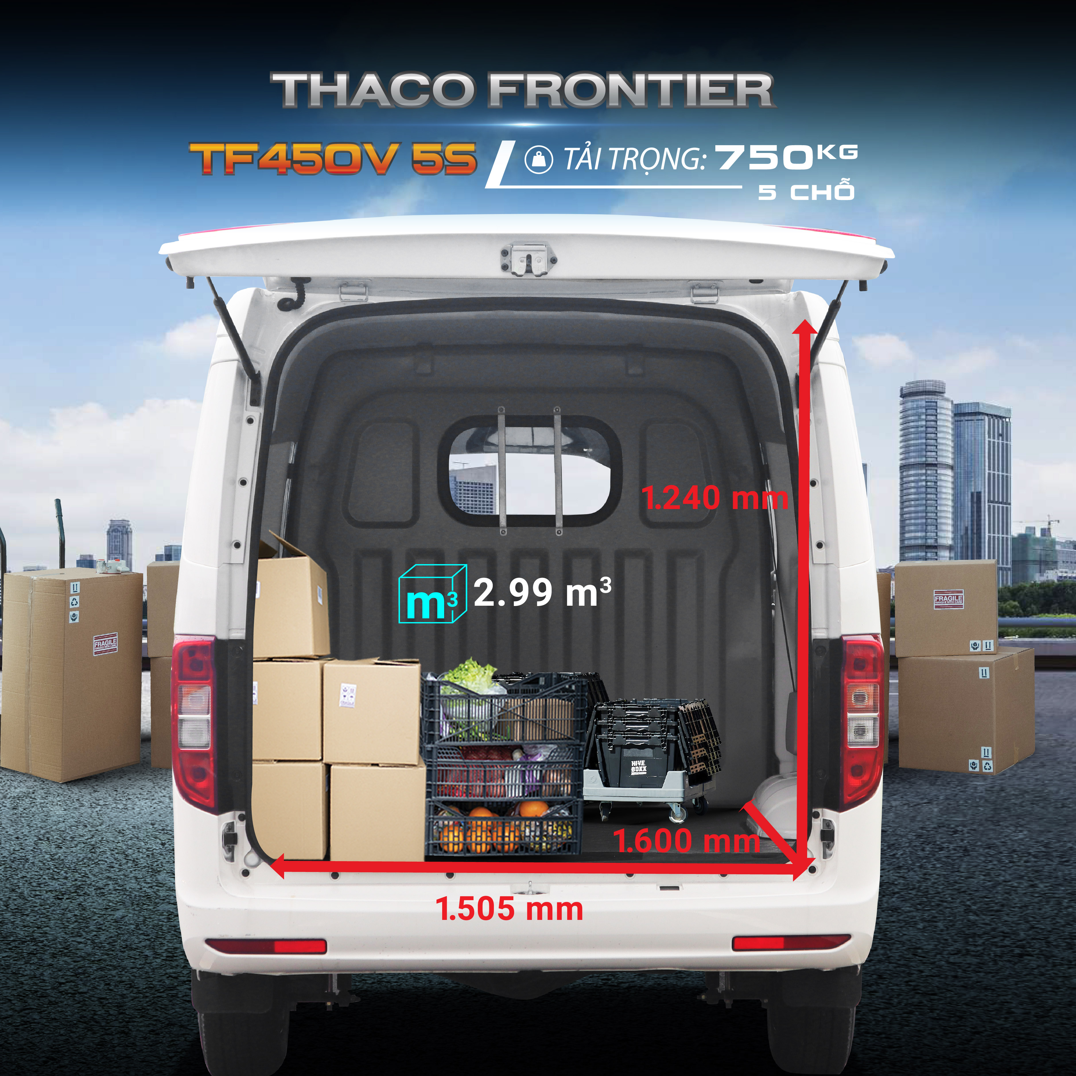 ✔️ Kích thước thùng hàng lớn 1.600 x 1.505 x 1.240 mm, thể tích 2.99 m3, mang đến giải pháp vận chuyển tối ưu và hiệu quả kinh tế cho cá nhân và doanh nghiệp